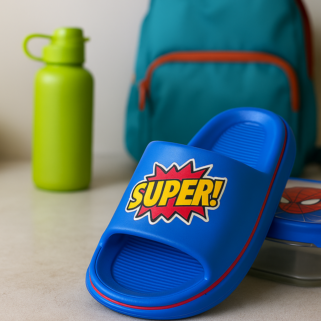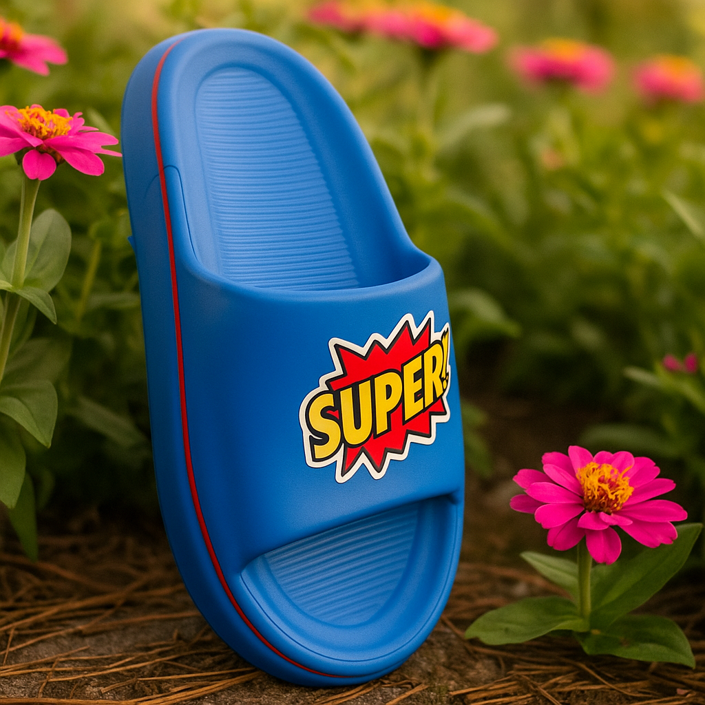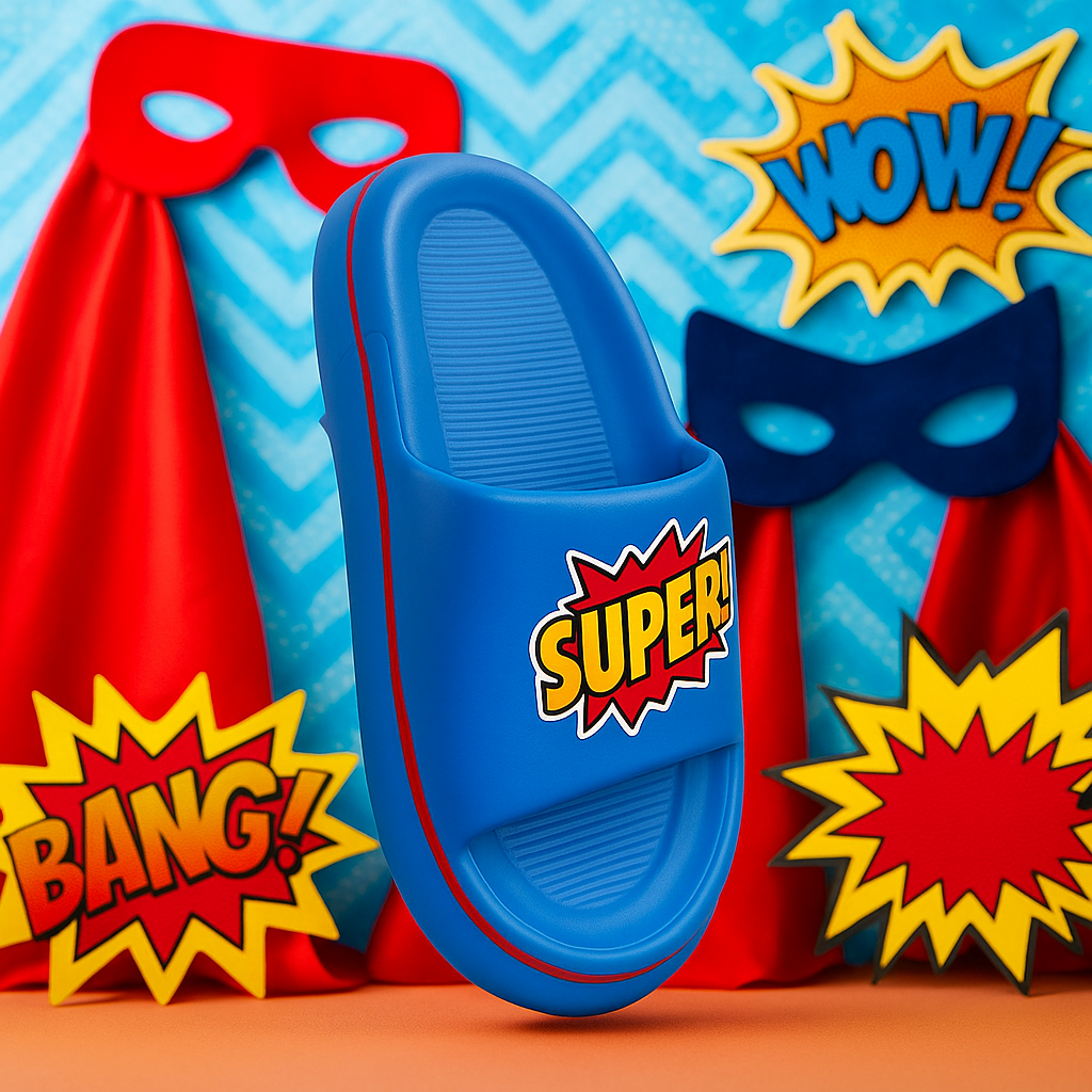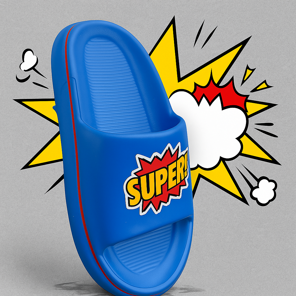 🎨 Vibrant Design: Eye-catching blue slipper with a superhero-inspired "SUPER!" graphic.