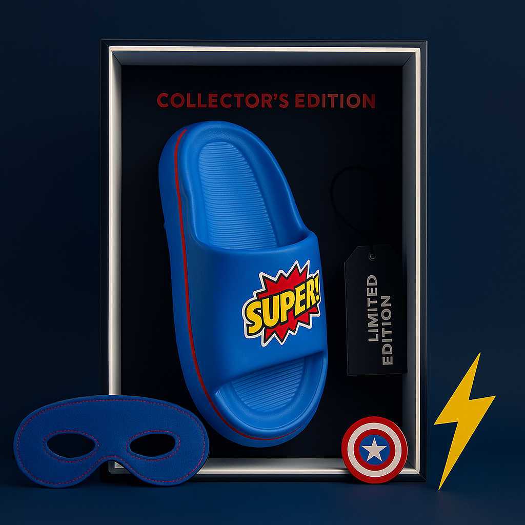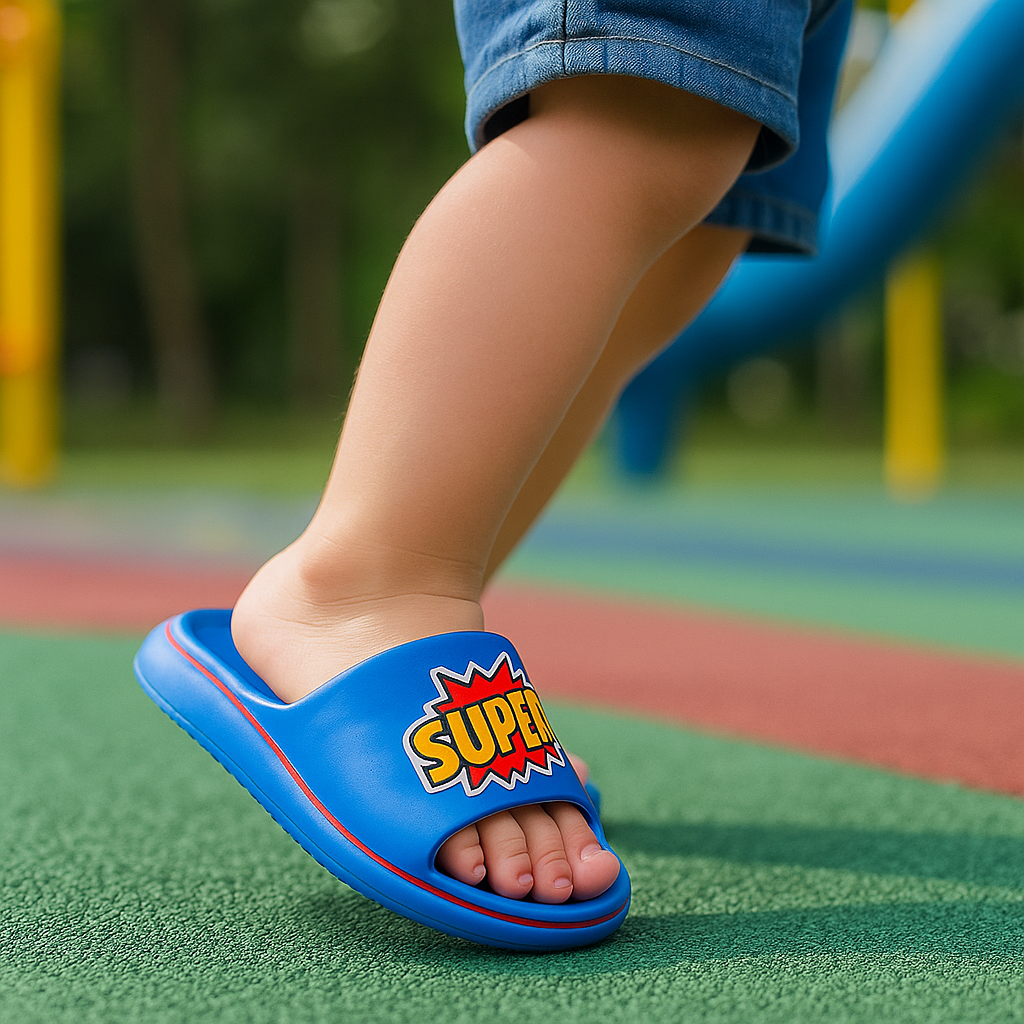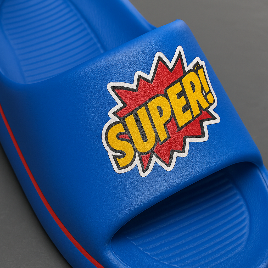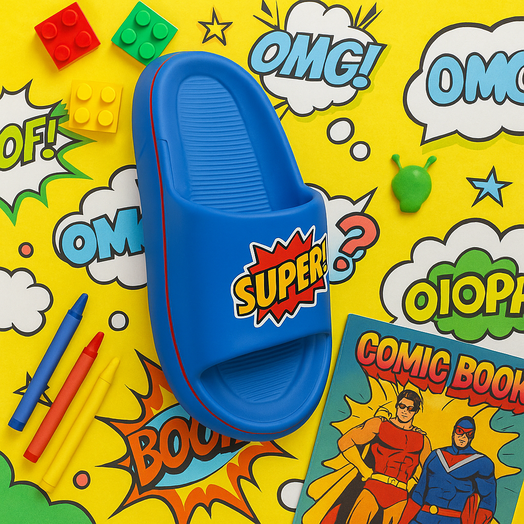 🎨 Vibrant Design: Eye-catching blue slipper with a superhero-inspired "SUPER!" graphic.