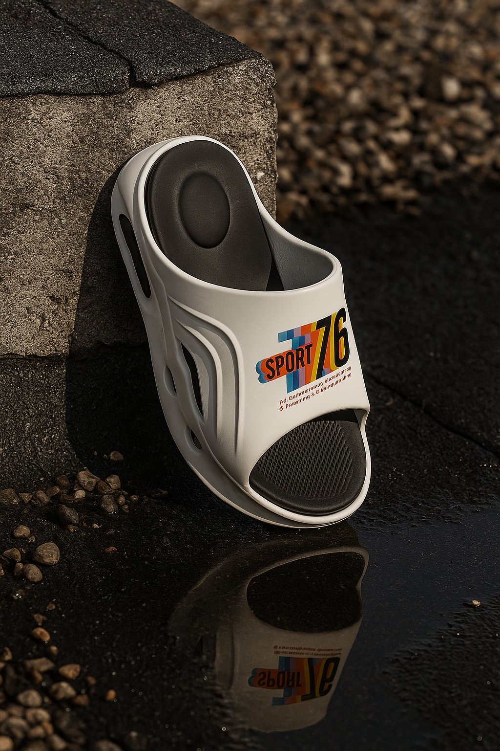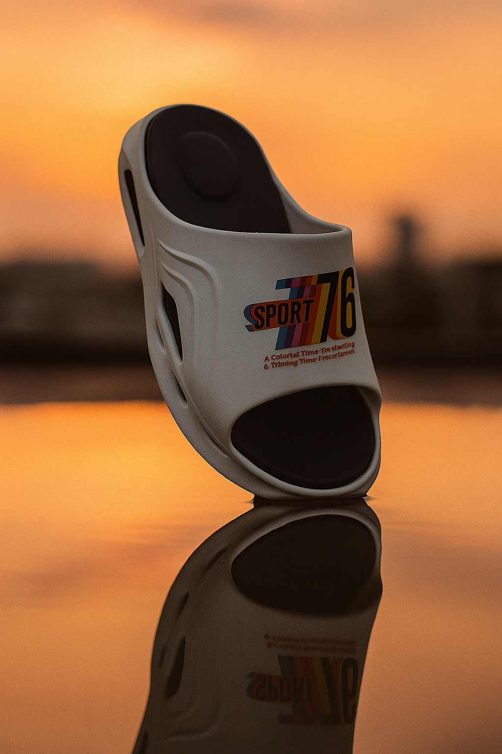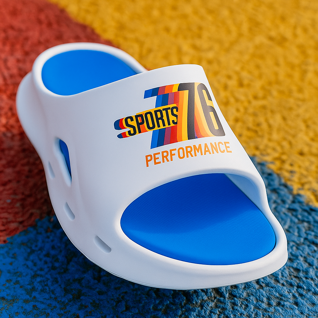 The Sport 76 Reflective Slide is a bold, stylish slipper designed for everyday comfort and standout looks. With smooth curves, side vents, and a soft cushioned footbed, it blends sporty design with casual wear. Inspired by retro racing, it features a colorful “Sport 76” logo and looks stunning in sunset lighting.double colour slipper