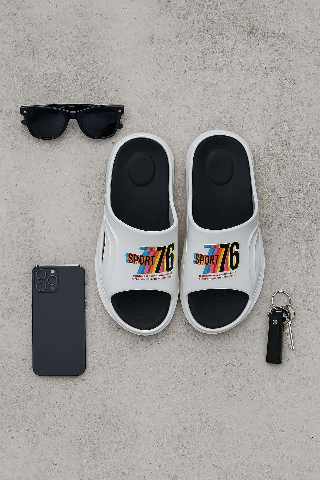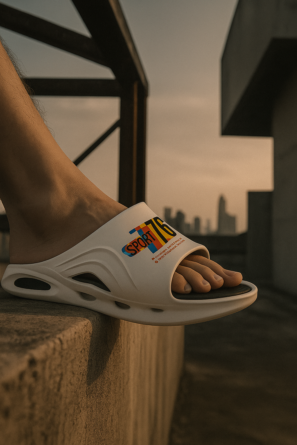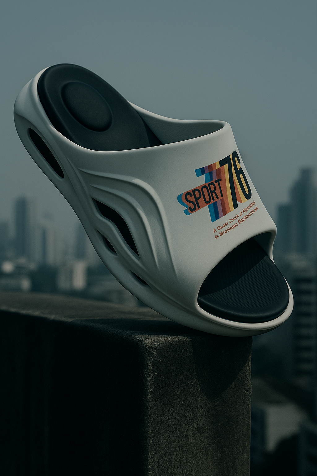 The Sport 76 Reflective Slide is a bold, stylish slipper designed for everyday comfort and standout looks. With smooth curves, side vents, and a soft cushioned footbed, it blends sporty design with casual wear. Inspired by retro racing, it features a colorful “Sport 76” logo and looks stunning in sunset lighting.double colour slipper